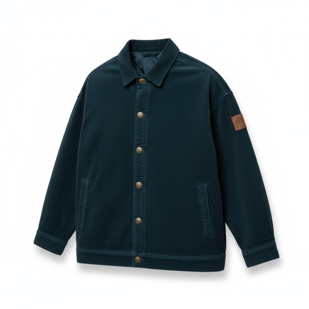 Detaillierte Details: Spüren Sie die unvergleichliche Textur des dunkelpetrolfarbenen Kordstoffs, der mit jedem Tragen noch geschmeidiger wird und eine Patina entwickelt, die Ihre Geschichte erzählt. Jeder Stich dieser Jacke zeugt von sorgfältiger Handwerkskunst; von den präzise vernähten goldfarbenen Knöpfen, die mühelos in die Knopflöcher gleiten und einen satten Klick erzeugen, bis hin zum robusten Leder-Patch, der nicht nur ein Logo trägt, sondern ein Versprechen für Langlebigkeit und Authentizität ist. Der locker geschnittene Korpus erlaubt es Ihnen, die Jacke über einem Pullover oder Hemd zu tragen, ohne dass sie einengt – eine Flexibilität, die Sie bei weniger durchdachten Designs vergeblich suchen werden. Das sanfte Gesteppte Innenfutter, das sich am Kragen dezent zeigt, ist ein Beleg für die Liebe zum Detail, die bei der Fertigung dieser Jacke im Vordergrund stand und die sie zu einer Investition macht, die Sie Jahr für Jahr schätzen werden.