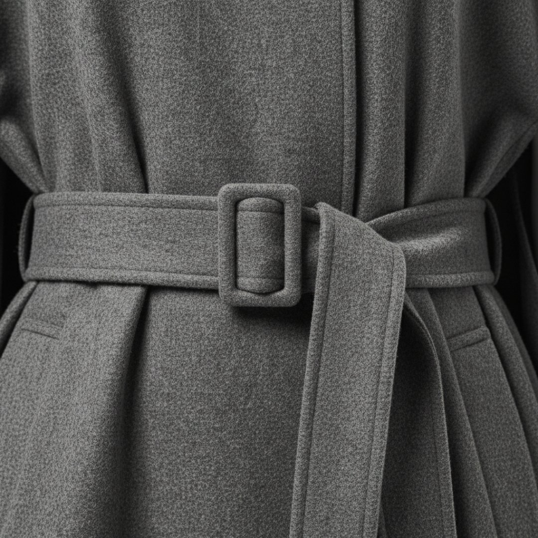 Gefertigt aus einer luxuriösen und wärmenden Wollmischung (70% Wolle, 30% Polyester), die für ein weiches Tragegefühl und Langlebigkeit sorgt. Der Gürtel besteht aus dem gleichen hochwertigen Material.